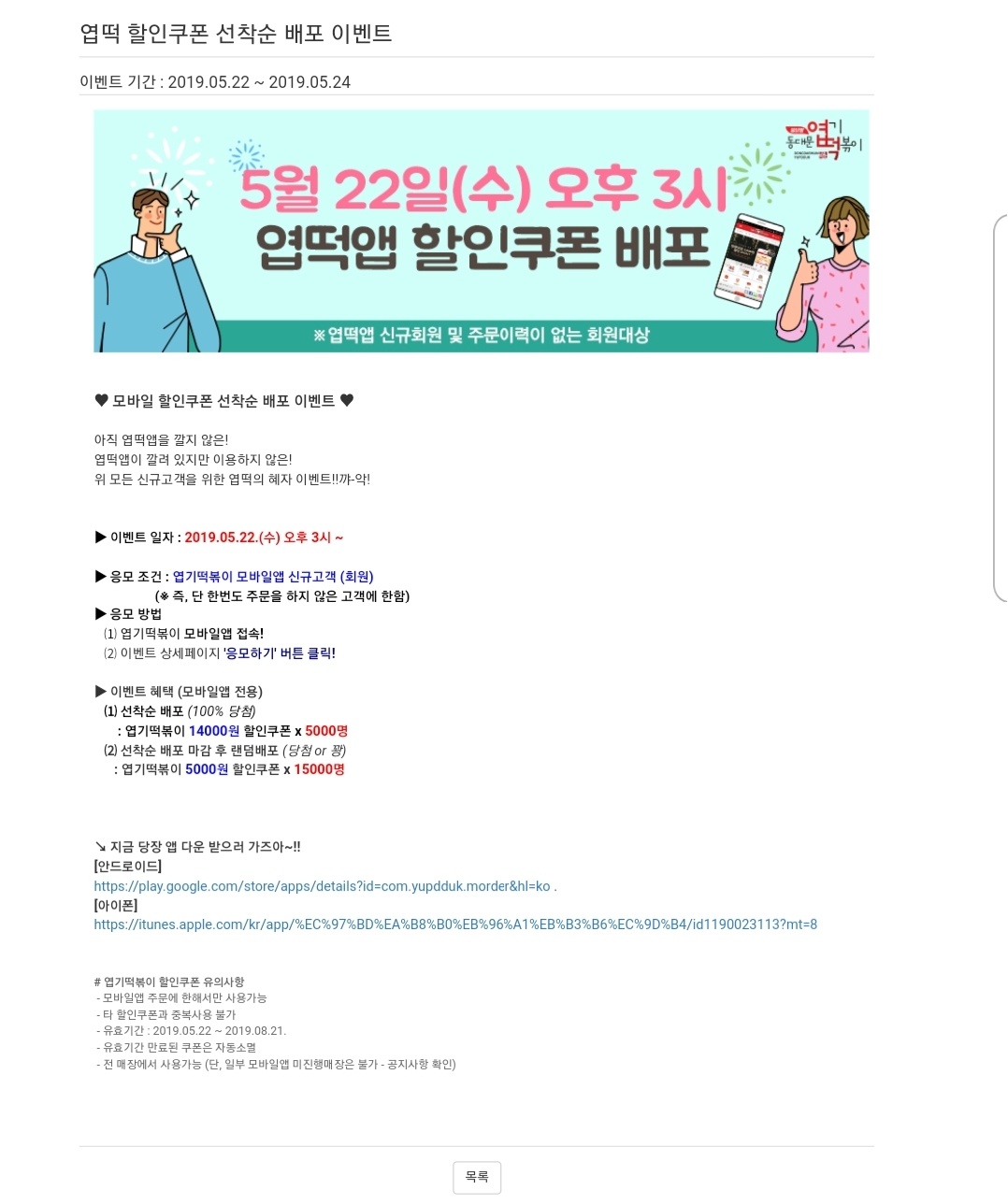 오늘 알려드릴 내용은 엽기 떡볶이 선착순 쿠폰 이벤트인데요.