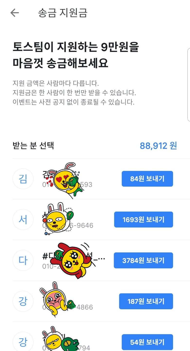토스에서 그 사람에게 지원해주는 금액은 많으면 100원 적으면 1원 사이를 왔다 갔다 하는 것입니다.